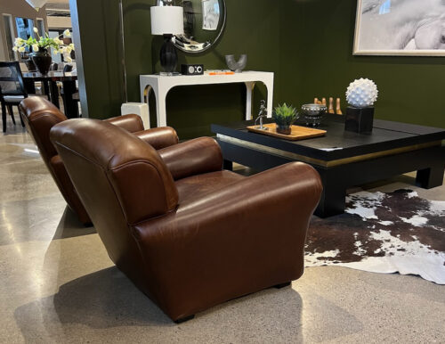 Pair of Custom Black Leather Lounge Chairs with Antiqued Brass Metal Frames