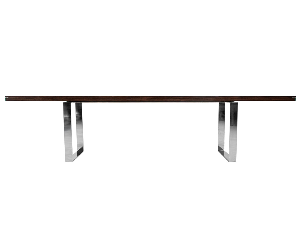 Introduce sophisticated modern simplicity to your dining area with this handcrafted table by Carrocel. Featuring a high-gloss, rich walnut top accented with stainless steel details, it rests upon elegantly sculpted stainless steel pedestal bases. Rooted in transitional style with a clean modern aesthetic, this piece is available for custom order in your preferred finish and size, ensuring a perfect fit for your space.