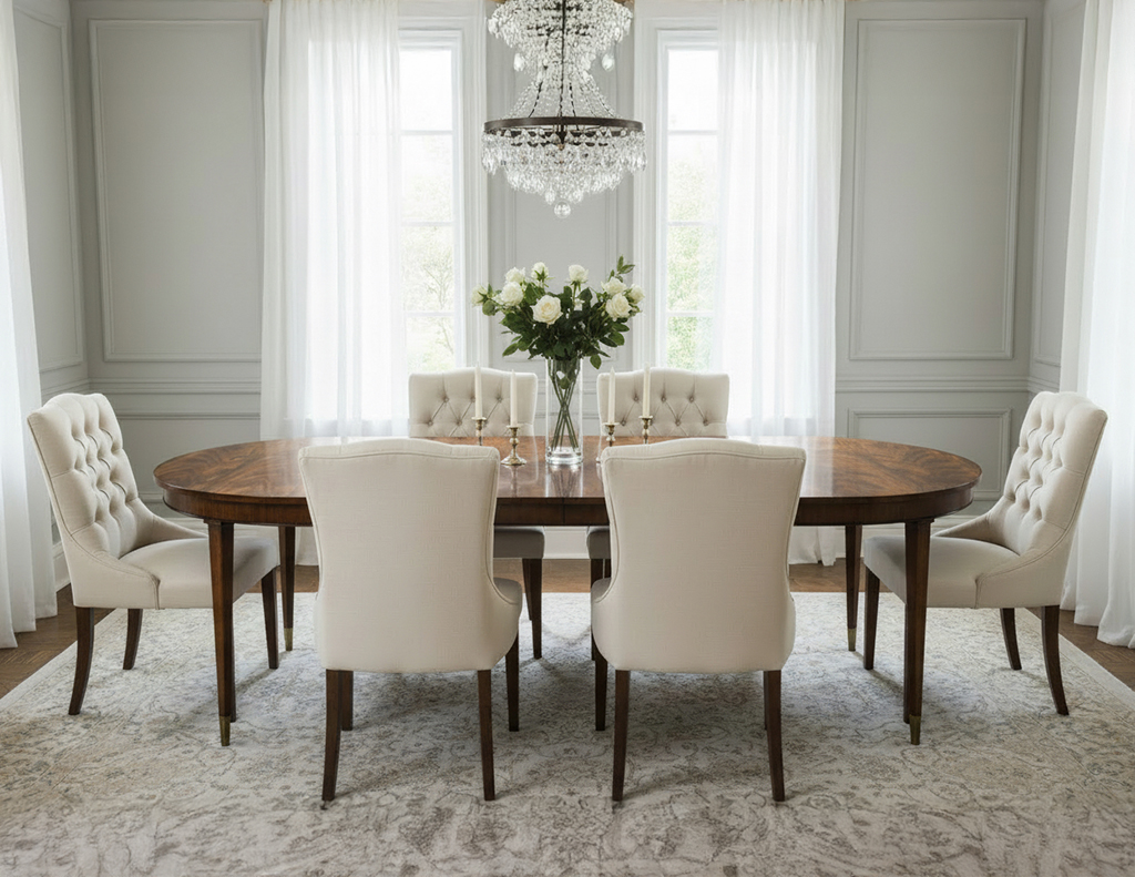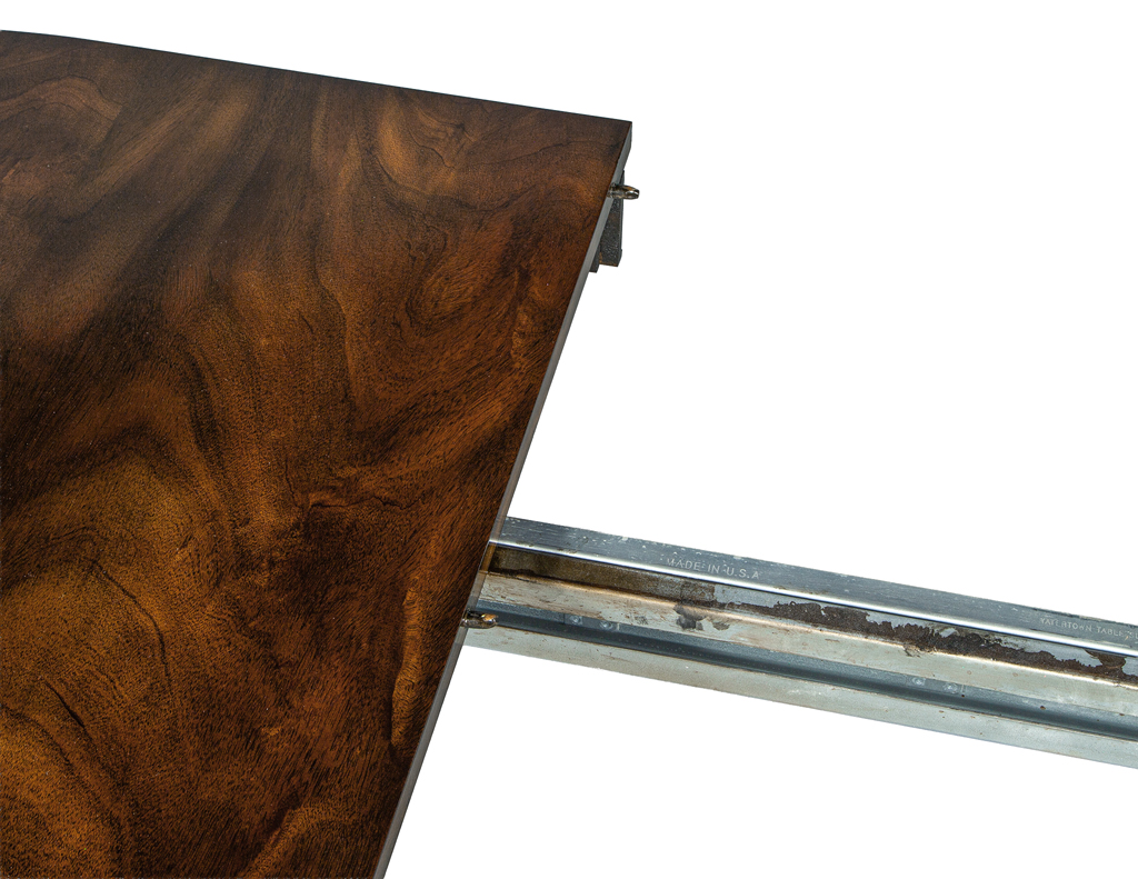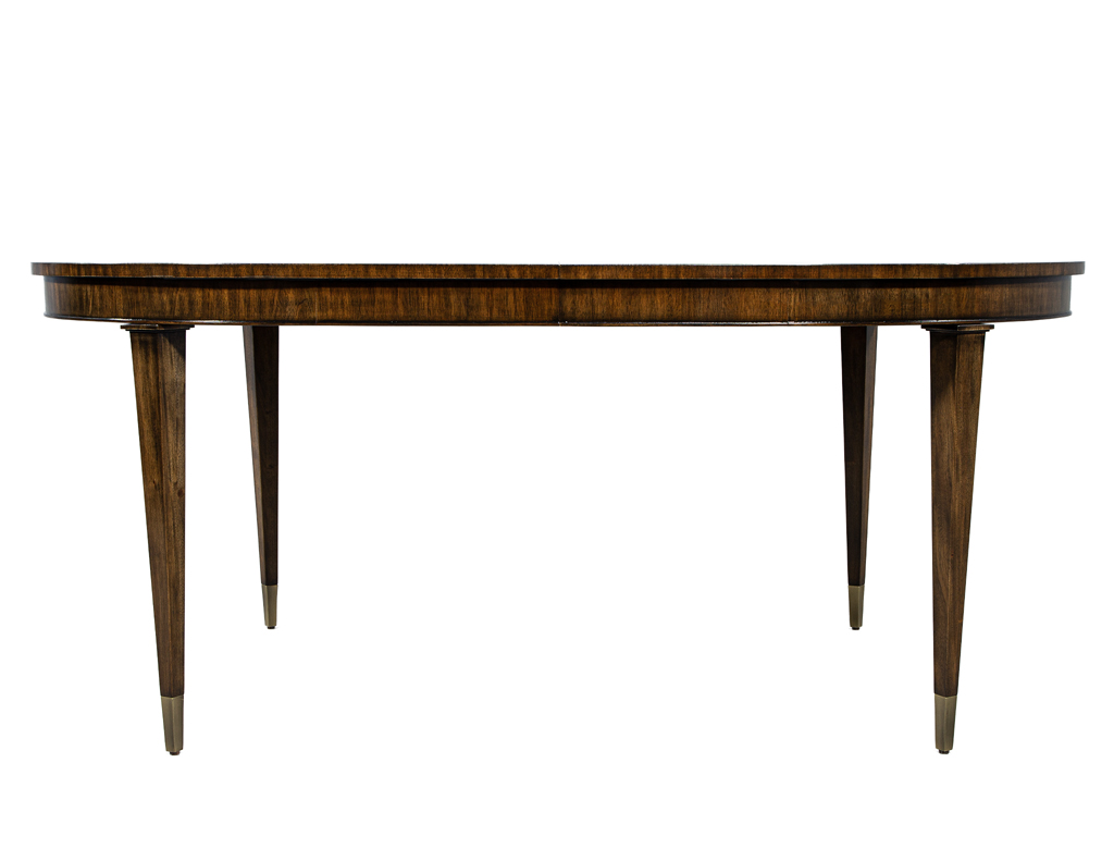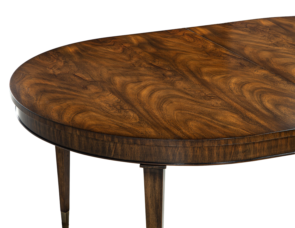 This Hepplewhite-inspired dining table showcases a stunning natural lacquer that beautifully illuminates the flamed mahogany grain. Crafted in the USA, it features solid mahogany tapered legs with elegant brass caps for a refined, timeless aesthetic. The table is brand new and includes two 18″ leaf extensions, expanding from 72″ to an impressive 108″. A luxurious statement piece designed to elevate any dining space.