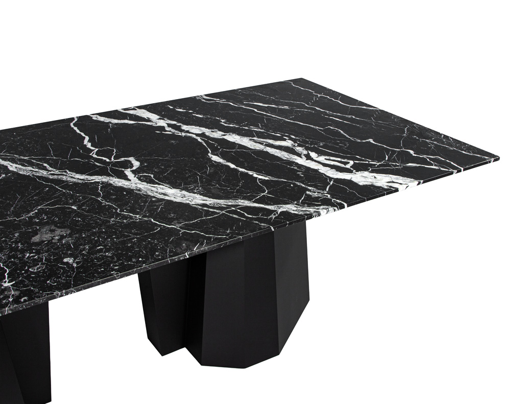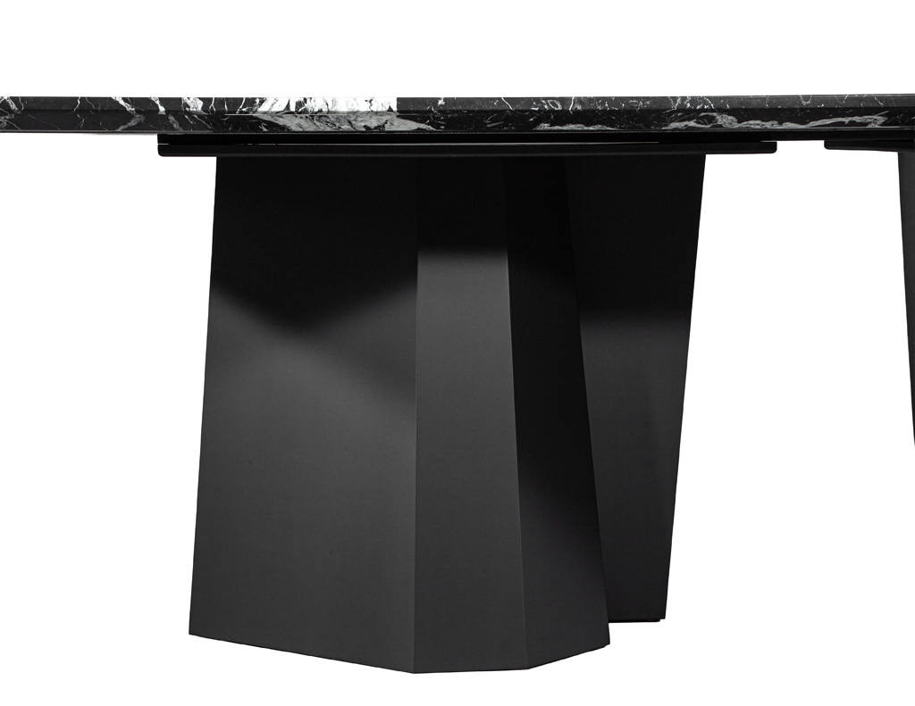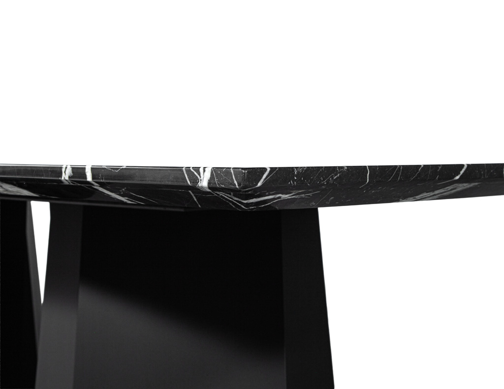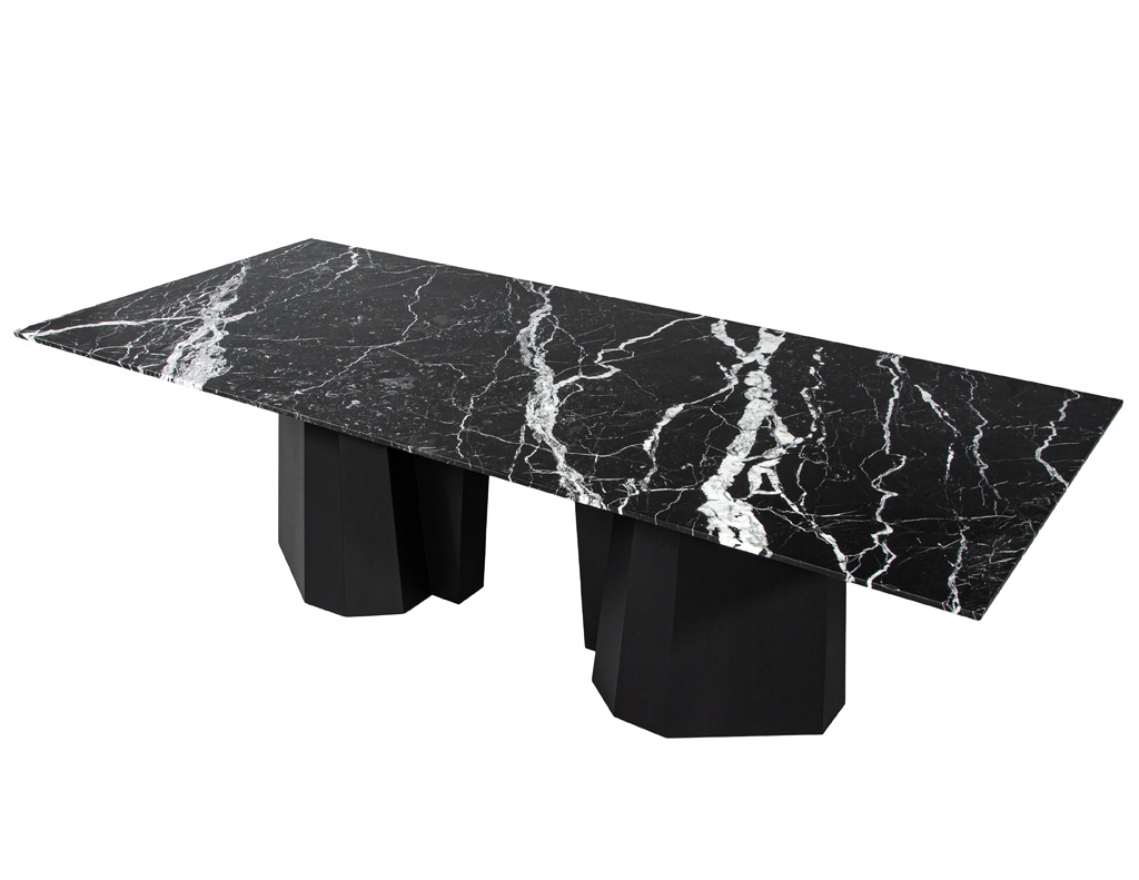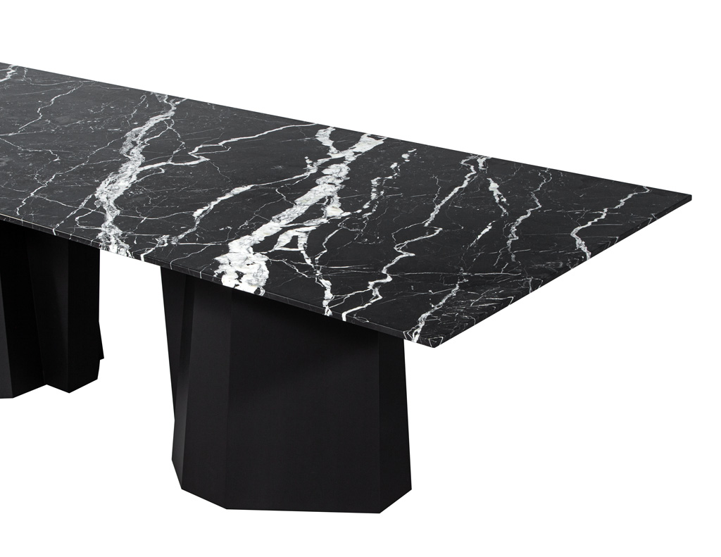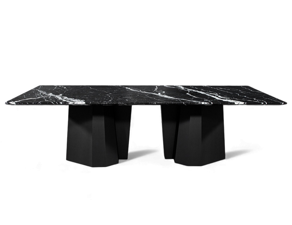 Introducing the Nero Milano, a Carrocel custom creation that epitomizes modern luxury. This striking dining table features a breathtaking Italian marble top with dramatic white and grey veining, finished with a refined tapered edge for a sleek, sculptural profile. Its bold hand-sculpted geometric bases bring a distinctive contemporary edge, balancing artistry with architectural strength. Each piece is meticulously handcrafted by Carrocel’s master artisans and is available for custom order. A true statement of sophistication designed to elevate any dining space.