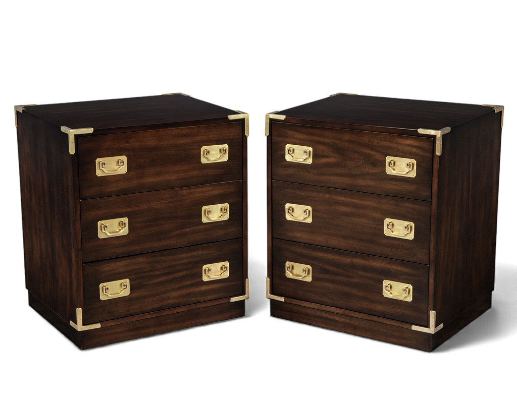 This pair of vintage 1970’s campaign style mahogany chests features rich mahogany woods accented with brass corner details and hardware for a timeless, elevated look. Each chest offers three spacious drawers lined in black felt, combining style with practical storage. The satin mahogany finish beautifully highlights the natural grain, with only minor metal imperfections and subtle micro dents consistent with age. Expertly restored, they present in excellent condition and add refined character to any interior.