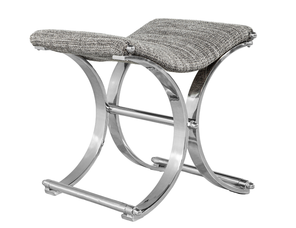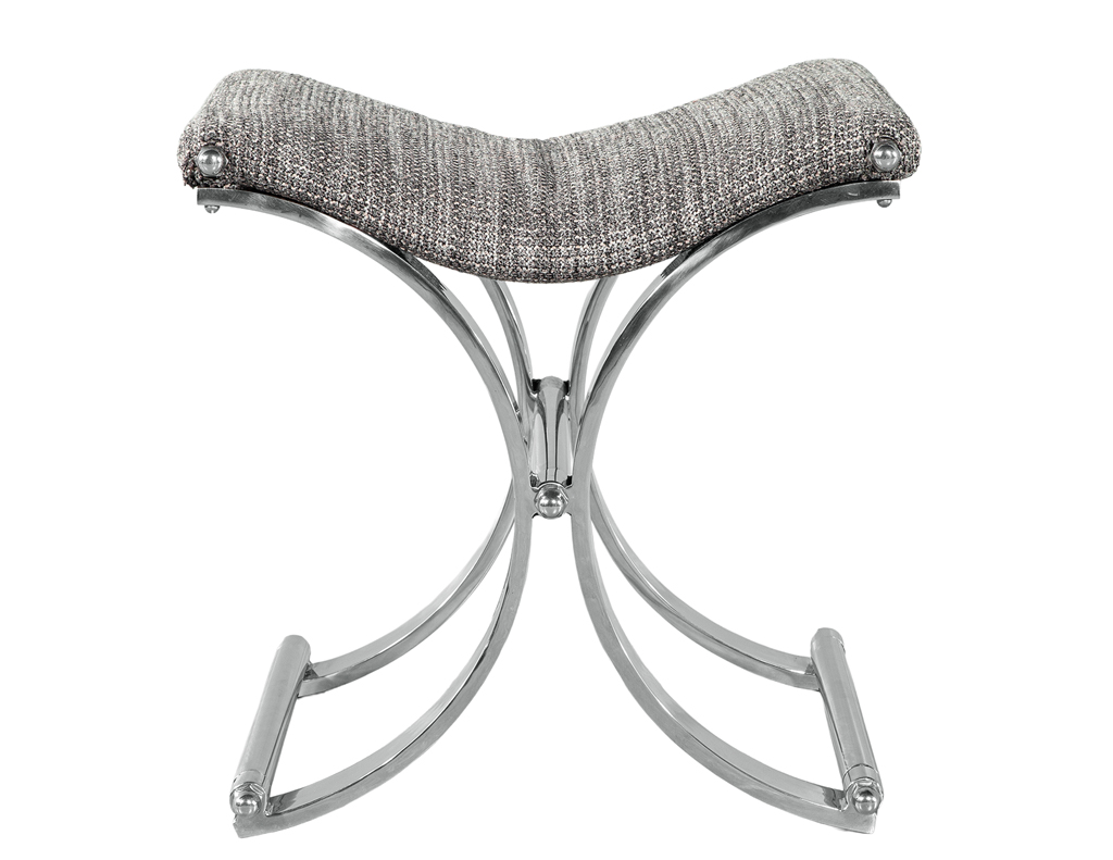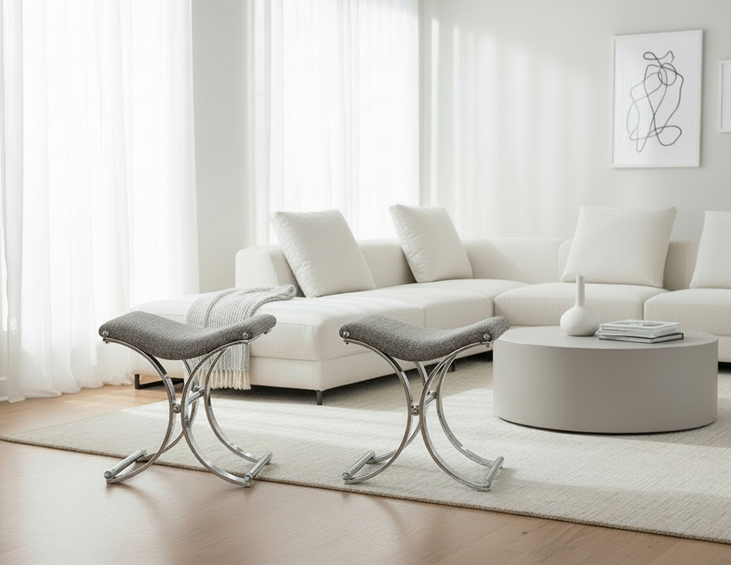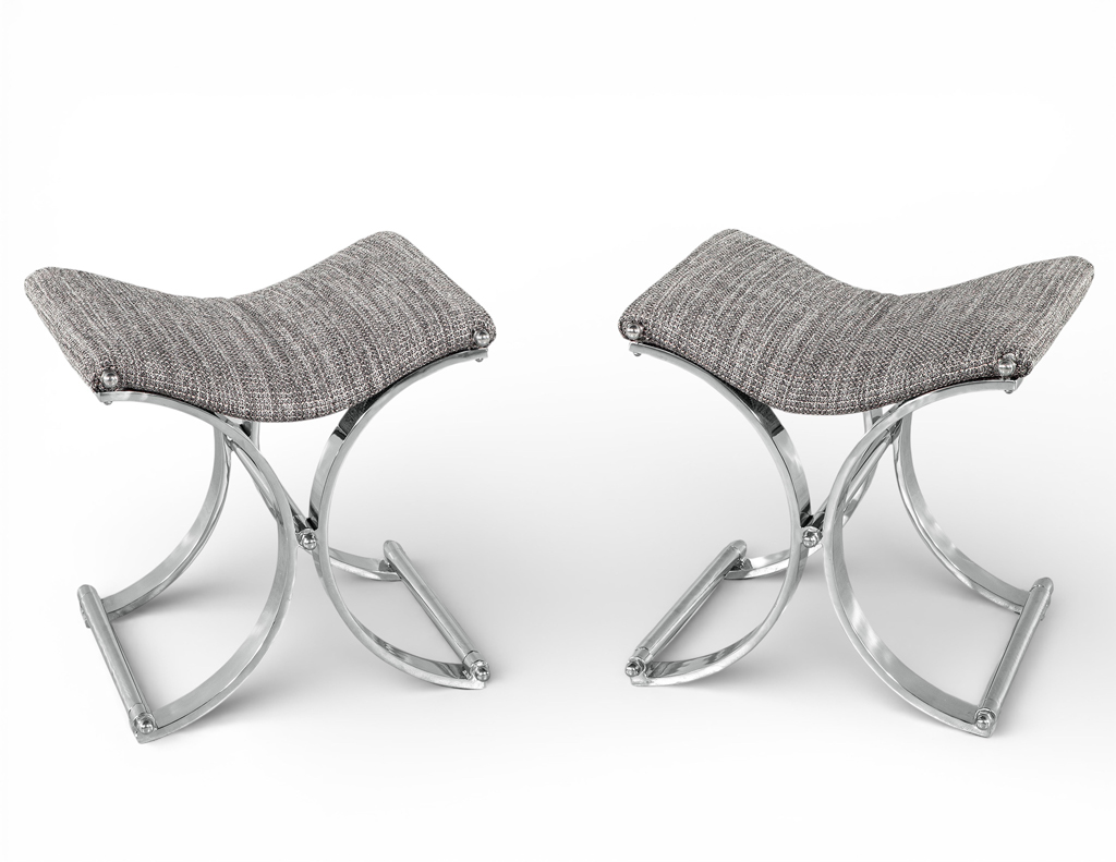 This striking pair of vintage polished metal X-benches feature uniquely curved frames that embody iconic 1970’s mid-century modern design with a fresh, contemporary edge. The newly upholstered seats are finished in a high-performance textured grey and white fabric, adding subtle sophistication and durability. While the polished metal shows minimal imperfections consistent with age, the benches remain in exceptional condition. A timeless and sculptural addition to any refined interior.
