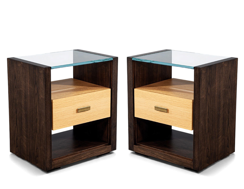 This pair of walnut and oak nightstand end tables exudes modern sophistication with a clean, minimalist silhouette. The rich espresso-finished walnut exterior frames a natural oak floating drawer, accented by unique brass-toned etched metal handles. Designed with an open-shelf concept above and below the drawer, the pieces balance functionality with elegant proportion. Finished with thick glass tops, these nightstands bring a refined and contemporary touch to any bedroom or living space.