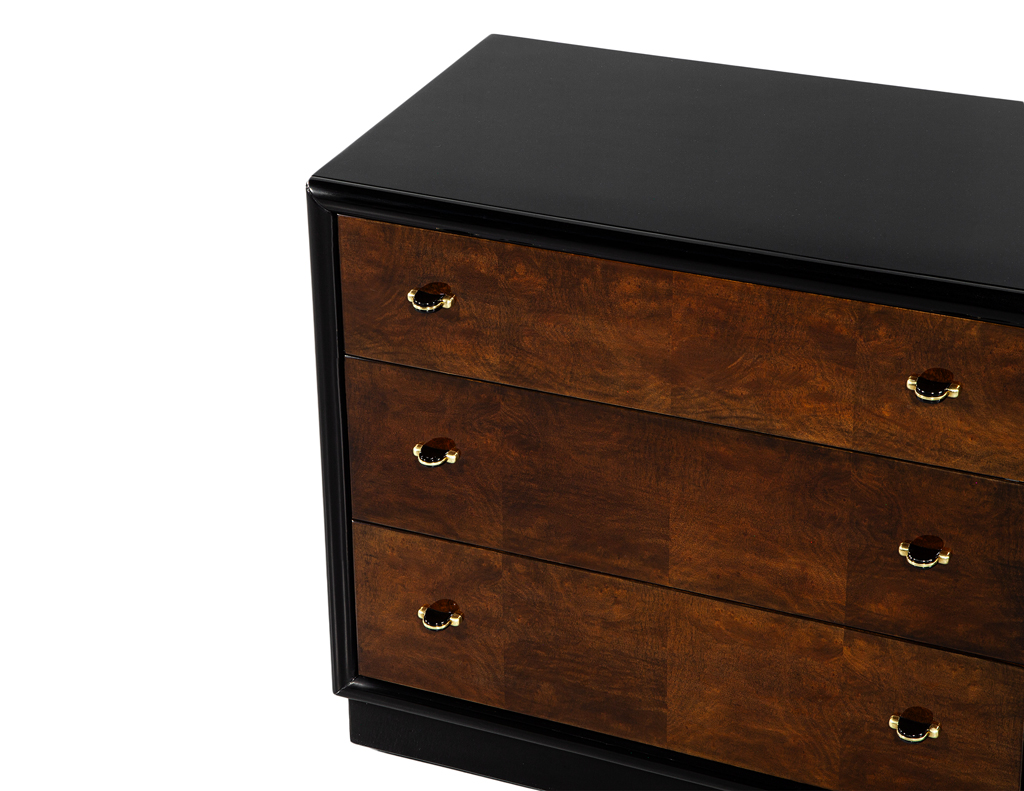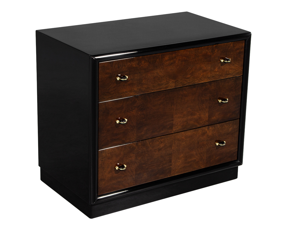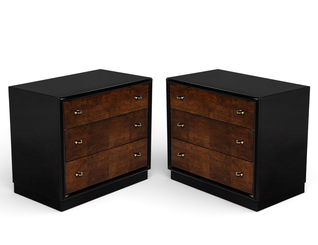 This striking pair of Henredon walnut chests features a sophisticated two-tone high-gloss finish, combining rich warm walnut drawer fronts with a sleek black lacquered exterior. The warm burled walnut grain is beautifully showcased beneath the lustrous polish, complemented by refined metal accent hardware for a touch of modern elegance. Each chest offers three spacious drawers with black felt-lined interiors, marrying luxury with functionality. Crafted by the iconic American furniture maker Henredon, these pieces exemplify timeless quality and design. Masterfully restored, they present in exceptional condition and bring an elevated presence to any room.
