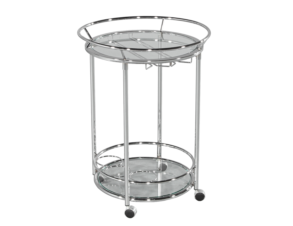 Sophisticated and versatile, this round polished metal bar cart embodies modern elegance with its sleek tubular frame. The design features a circular glass top paired with a lower glass shelf, complete with integrated bottle holsters for effortless entertaining. Resting on smooth caster wheels, combining functionality with refined style. A chic accent piece, it brings both glamour and practicality to any entertaining space.