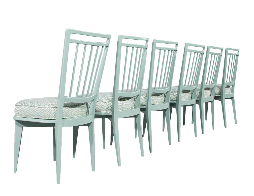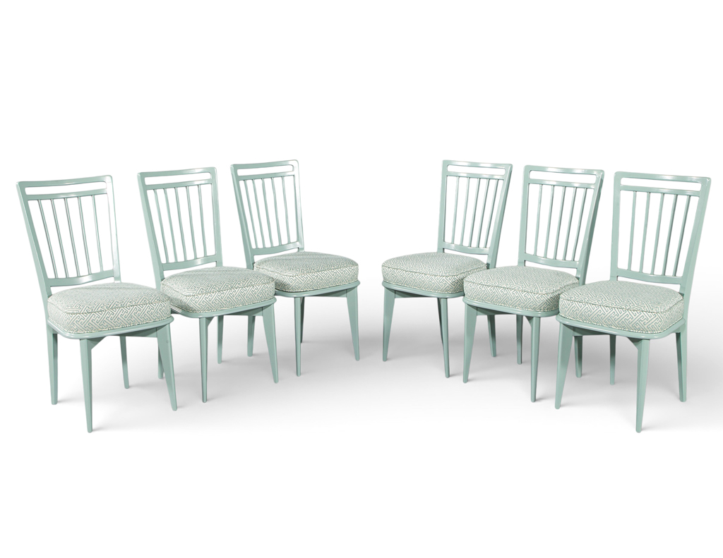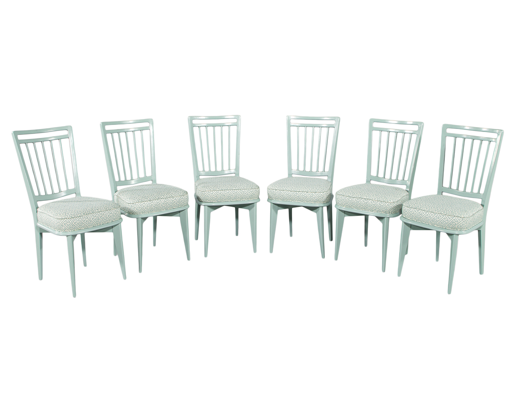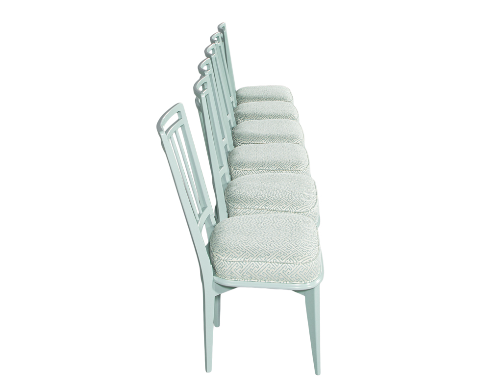 This set of 6 vintage mid-century modern dining chairs, originally crafted in 1940’s Italy, has been masterfully restored to showcase their sculptural elegance. The frames are finished in a refined sage green lacquer, giving the chairs a fresh yet timeless presence. Each seat is upholstered in a luxurious Kravet fabric featuring a sophisticated geometric pattern that beautifully complements the tone of the lacquered frames. One chair features a slightly different back pitch, reflecting the authentic handmade nature of the original set. Together, they offer a distinctive, elevated aesthetic ideal for any stylish dining space.