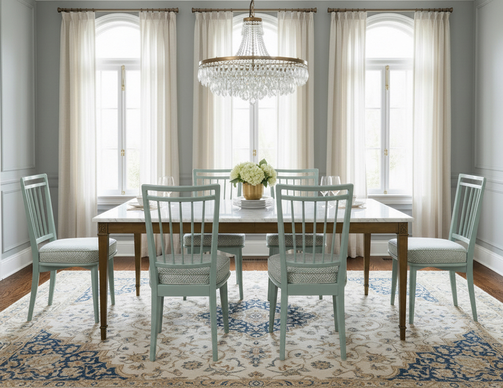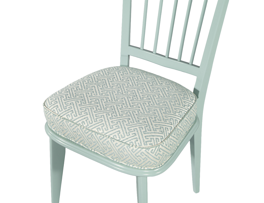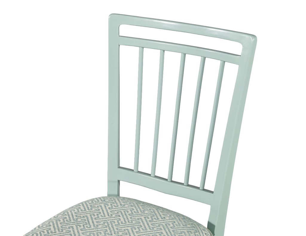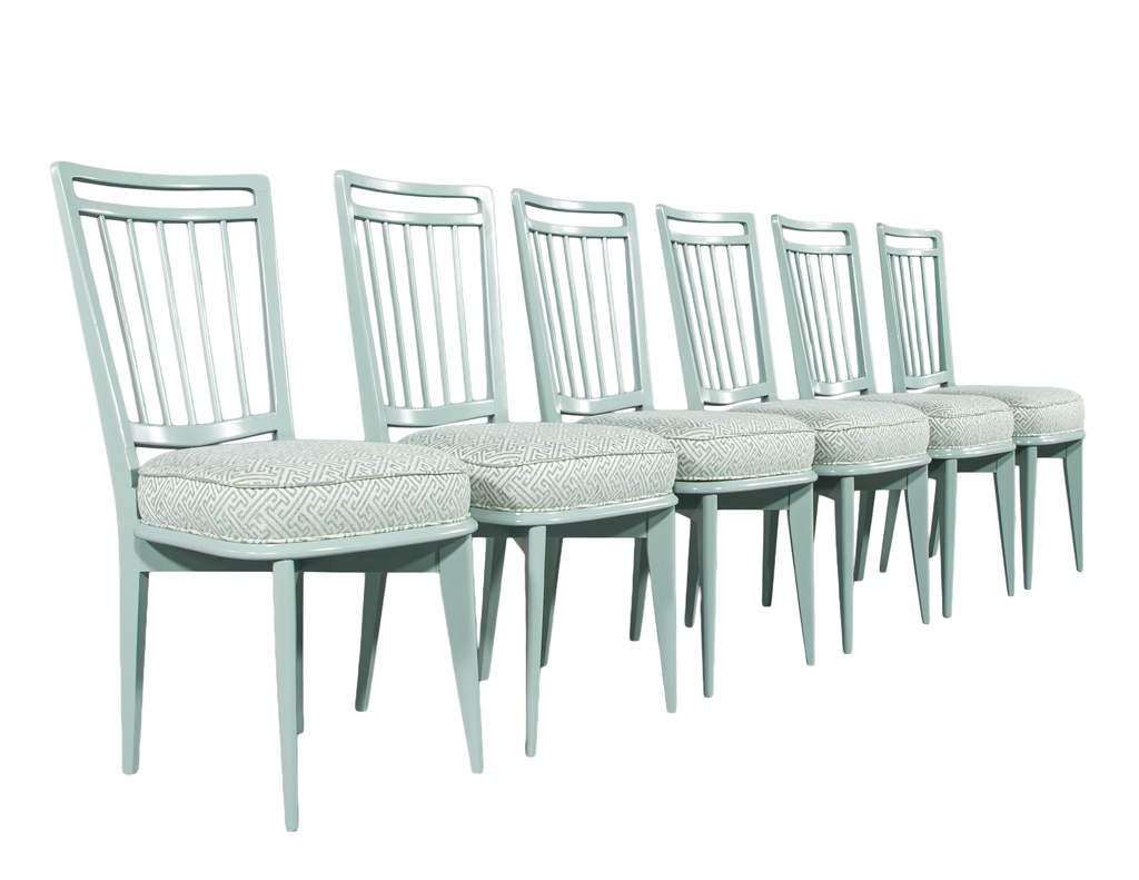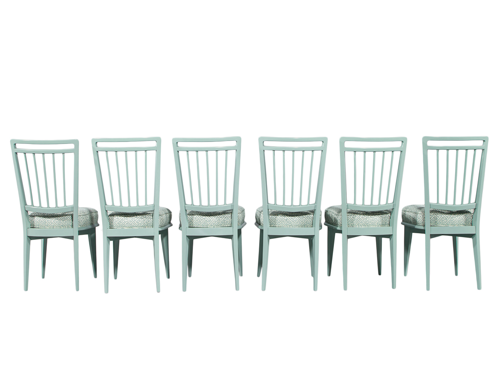 This set of 6 vintage mid-century modern dining chairs, originally crafted in 1940’s Italy, has been masterfully restored to showcase their sculptural elegance. The frames are finished in a refined sage green lacquer, giving the chairs a fresh yet timeless presence. Each seat is upholstered in a luxurious Kravet fabric featuring a sophisticated geometric pattern that beautifully complements the tone of the lacquered frames. One chair features a slightly different back pitch, reflecting the authentic handmade nature of the original set. Together, they offer a distinctive, elevated aesthetic ideal for any stylish dining space.