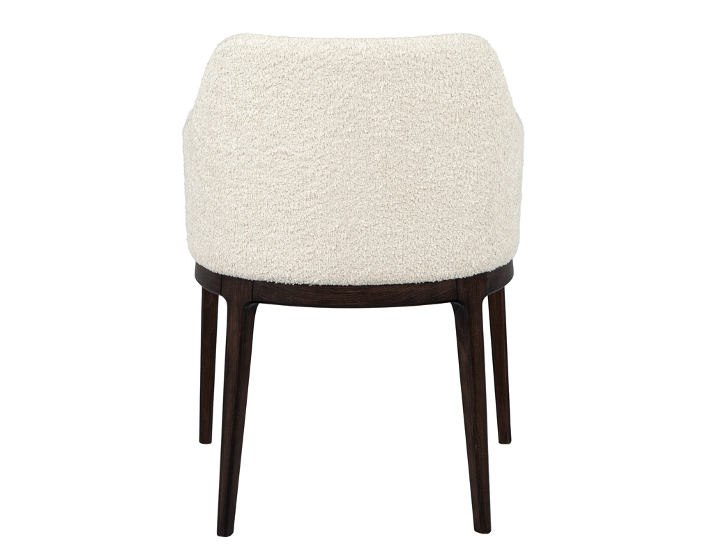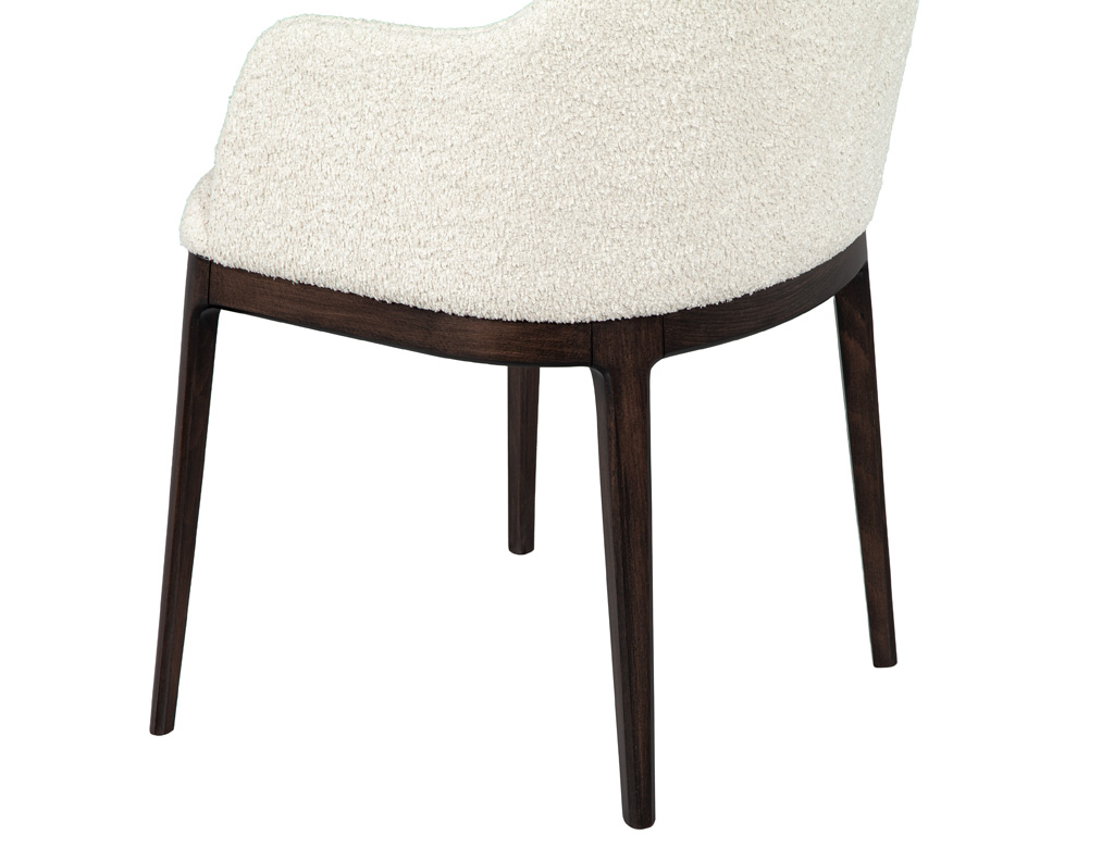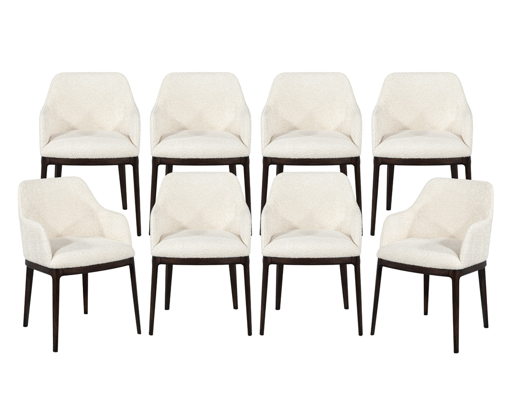 This elegant set of 8 Reece dining chairs by Carrocel features a refined beechwood frame in a dark espresso satin finish, complemented by sleek tapered legs and a gracefully curved back with subtle sloping arms. Upholstered in a luxurious textured cream boucle, each chair offers exceptional comfort and timeless sophistication. The sculptural silhouette and impeccable craftsmanship make this set a standout addition to any refined dining space.
