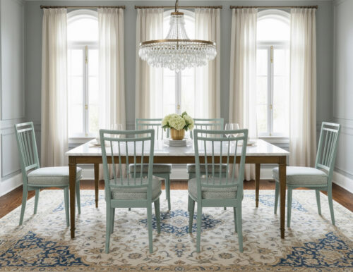 - Pair with minimalist dining chairs—wooden frames with curved backs or vinyl cushions.